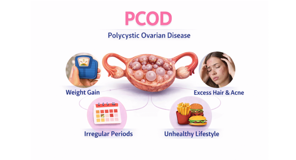 PCOD is primarily a lifestyle-related disorder and is very common among young women today. Stress, unhealthy diet, lack of physical activity, and weight gain play a major role in triggering PCOD.