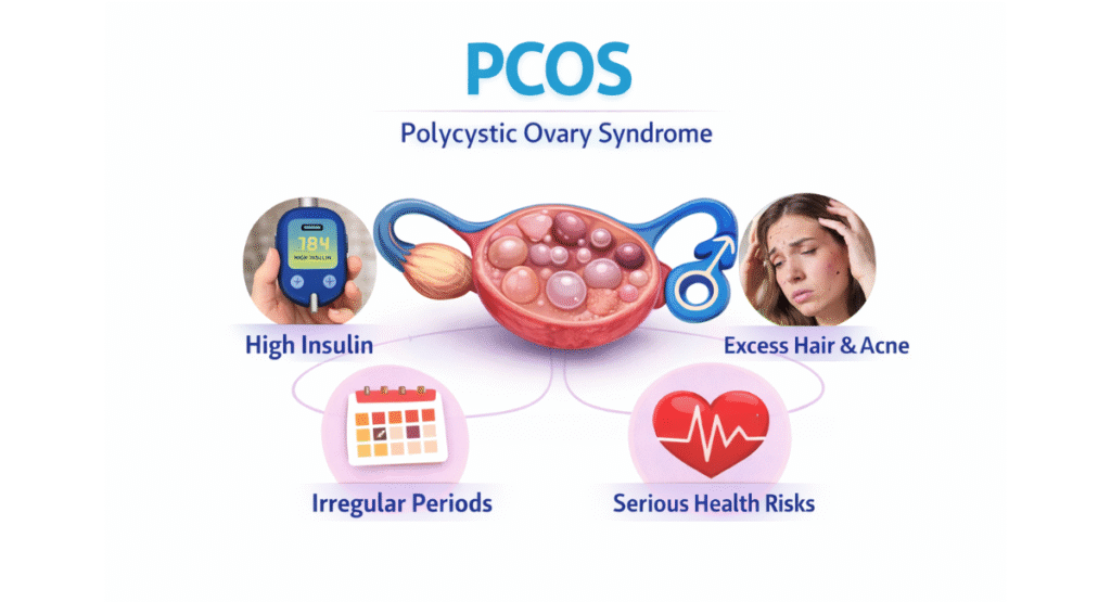PCOS (Polycystic Ovary Syndrome) is a more severe endocrine disorder that affects the body’s metabolism, insulin levels, and reproductive hormones. It is considered a metabolic syndrome, not just an ovarian problem.